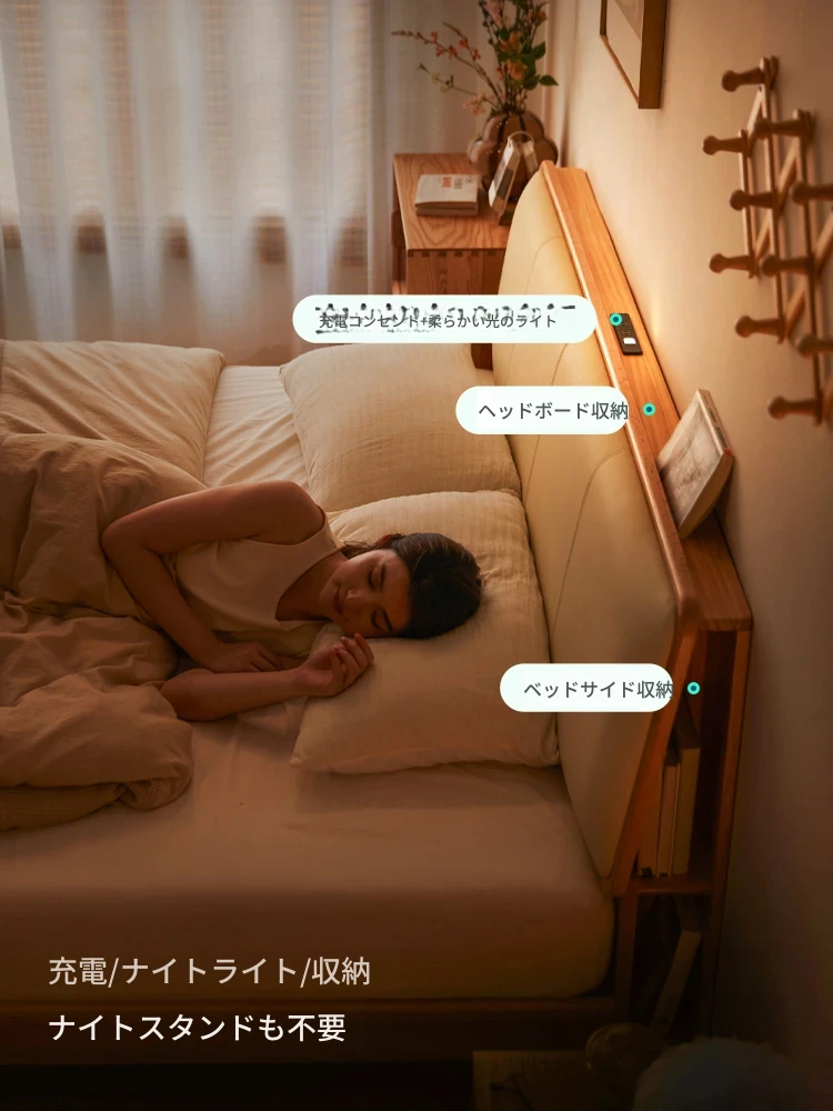 林氏家居のシンプルな無垢材フレームベッド・自然木風スタイル 1.5メートルのソフトパッケージダブルベッド・スリムデザインの高品質OU3A