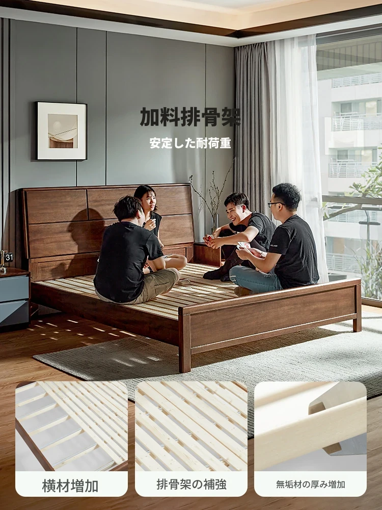 林氏家居の高品質ホワイトアッシュ無垢材ダブルベッド - ウォールナットカラー、1.8mサイズ、頑丈なスリムスラットフレーム付き。家のインテリアにぴったりなスタイリッシュな選択肢!