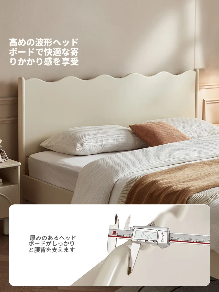 林氏家居のスタイリッシュなホワイトウッド製1.5mダブルベッド - ナチュラルなクリームカラーの波形デザインで、快適な睡眠空間を演出!家庭にぴったりの高品質家具です。