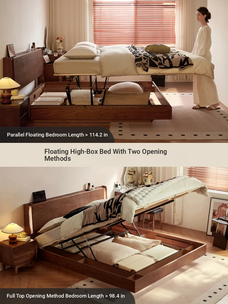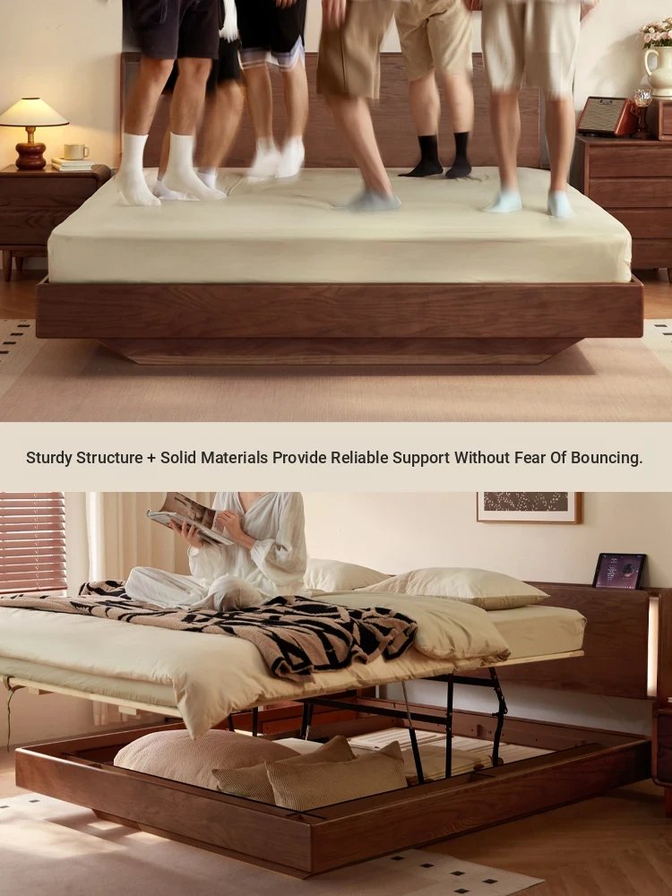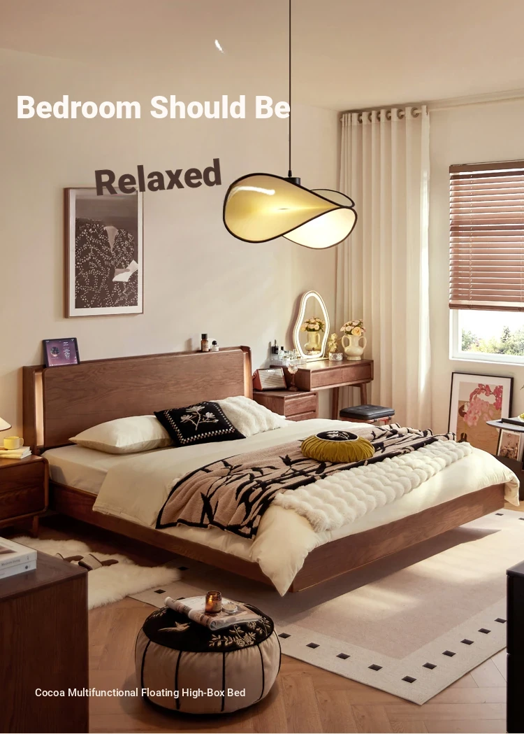 Lins's Home Walnut Solid Wood Bed with Storage - Elegant Floating Design in Oak Finish | Cocoa Series by Lins's Woodworks - Perfect for Your Master Bedroom!